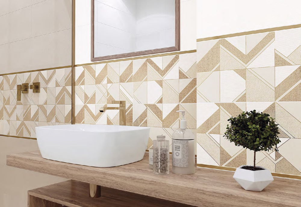 Матовая поверхность имеет рисунок с орнаментом, геометрический узор. Эта плитка применяется для декорирования стен внутренних помещений: ванной, туалета.