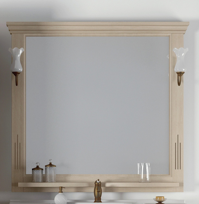 Сложные филенчатые фасады тумбы, большое зеркало в раме из массива дерева с двумя изысканными светильниками придают неповторимый шарм этой модели. Модель комплектуется удобной керамической раковиной производства Чехии.