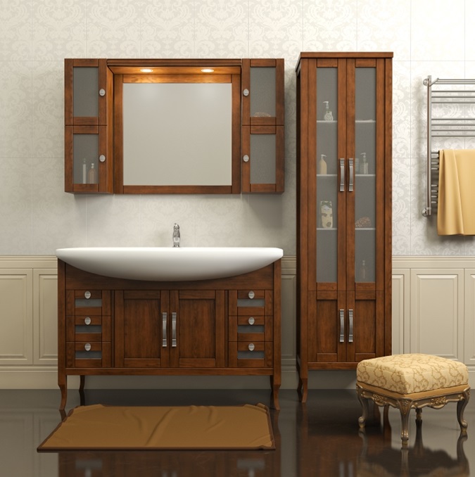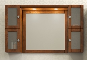 Комплект мебели «Мираж» изготовлен из массива дерева. Он имеет прямоугольные формы, которые разбавлены необычной ножкой и плавными изгибами раковины. В комплект входит зеркало в деревянной раме с подсветкой в козырьке, 2 подвесных шкафчика, тумба с шестью выдвижными ящиками, украшенными матовым стеклом, и двумя открывными дверками, керамическая раковина.