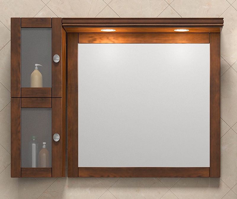 Комплект мебели «Мираж» изготовлен из массива дерева. Он имеет прямоугольные формы, которые разбавлены необычной ножкой и плавными изгибами раковины. В комплект входит зеркало в деревянной раме с подсветкой в козырьке, подвесной шкафчик, тумба с тремя выдвижными ящиками, украшенными матовым стеклом, и двумя открывными дверками, керамическая раковина.