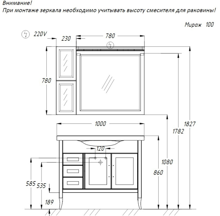 Зеркало со шкафчиком и козырек зеркала "Мираж 100"